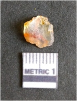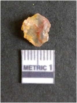 | Description / विवरण | The chalcedony flake is pale in color and translucent in appearance. The piece has s harp flaked ends and a bulbous end due to flaking. The flake has a crypto-crystalline silica matrix. |