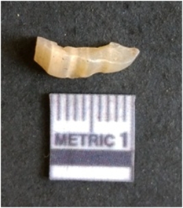 | Description / विवरण | The chalcedony flake is pale in color and translucent in appearance. The piece has s harp flaked ends and a bulbous end due to flaking. The flake has a crypto-crystalline silica matrix. |
