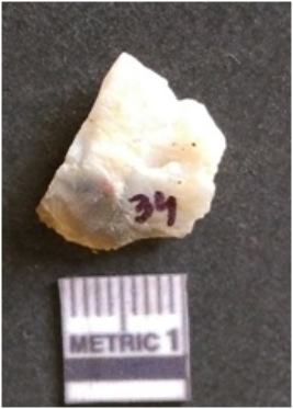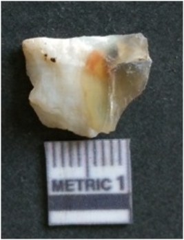 | Description / विवरण | The flake has irregular fracture pattern and sharp flaked edges as a result of lithic knapping activity. The piece is pale, with surface flake scars and a bulbous end. The quartz flake is glassy, and transparent. |
