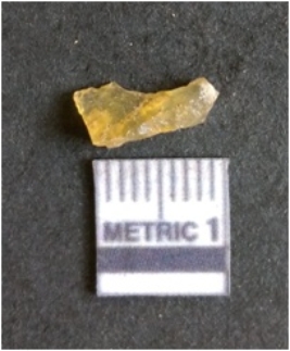 | Description / विवरण | The chalcedony flake is pale in color and translucent in appearance. The piece has s harp flaked ends and a bulbous end due to flaking. The flake has a crypto-crystalline silica matrix. |