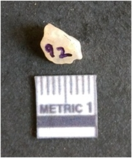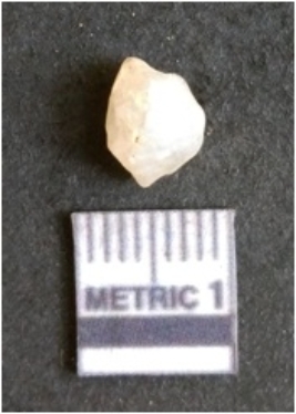 | Description / विवरण | The chalcedony flake is pale in color and translucent in appearance. The piece has s harp flaked ends and a bulbous end due to flaking. The flake has a crypto-crystalline silica matrix. |