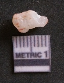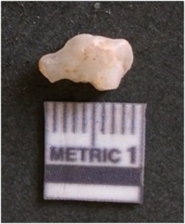 | Description / विवरण | The flake has irregular fracture pattern and sharp flaked edges as a result of lithic knapping activity. The piece is pale, with surface flake scars and a bulbous end. The quartz flake is glassy, and transparent. |