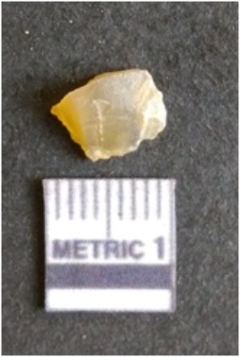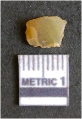 | Description / विवरण | The chalcedony flake is pale in color and translucent in appearance. The piece has s harp flaked ends and a bulbous end due to flaking. The flake has a crypto-crystalline silica matrix. |