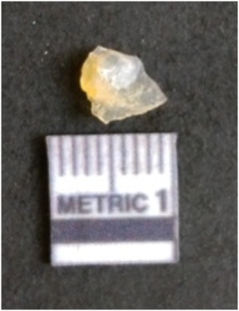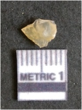 | Description / विवरण | The chalcedony flake is pale in color and translucent in appearance. The piece has s harp flaked ends and a bulbous end due to flaking. The flake has a crypto-crystalline silica matrix. |