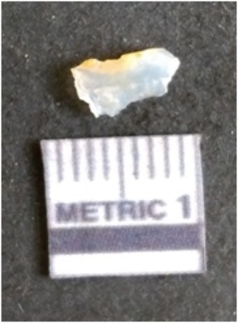 | Description / विवरण | The chalcedony flake is pale in color and translucent in appearance. The piece has s harp flaked ends and a bulbous end due to flaking. The flake has a crypto-crystalline silica matrix. |