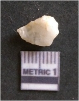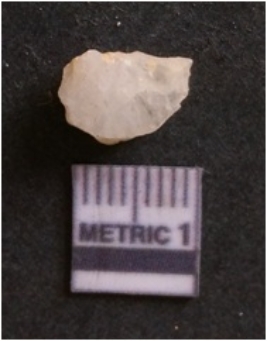| Description / विवरण | The flake has irregular fracture pattern and sharp flaked edges as a result of lithic knapping activity. The piece is pale, with surface flake scars and a bulbous end. The quartz flake is glassy, and transparent. |
