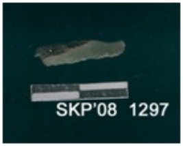 | Description / विवरण | This is a lithic debitage green in color, flat ventral side, bulb of percussion at the tapered end. Flaked ridges on the dorsal side. |