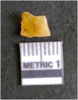 | Description / विवरण | The chalcedony flake is pale in color and translucent in appearance. The piece has s harp flaked ends and a bulbous end due to flaking. The flake has a crypto-crystalline silica matrix. |