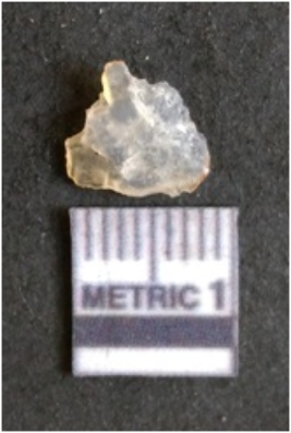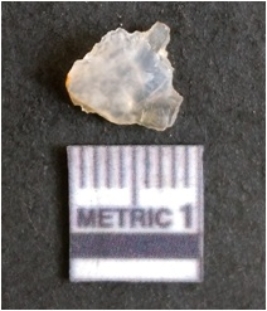 | Description / विवरण | The chalcedony flake is pale in color and translucent in appearance. The piece has s harp flaked ends and a bulbous end due to flaking. The flake has a crypto-crystalline silica matrix. |