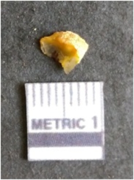 | Description / विवरण | The chalcedony flake is pale in color and translucent in appearance. The piece has s harp flaked ends and a bulbous end due to flaking. The flake has a crypto-crystalline silica matrix. |