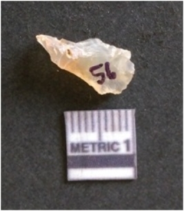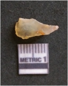 | Description / विवरण | The chalcedony flake is pale in color and translucent in appearance. The piece has s harp flaked ends and a bulbous end due to flaking. The flake has a crypto-crystalline silica matrix. |