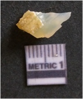 | Description / विवरण | The chalcedony flake is pale in color and translucent in appearance. The piece has s harp flaked ends and a bulbous end due to flaking. The flake has a crypto-crystalline silica matrix. |