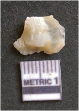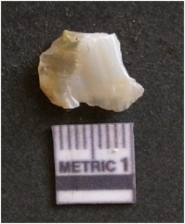 | Description / विवरण | The chalcedony flake is pale in color and translucent in appearance. The piece has s harp flaked ends and a bulbous end due to flaking. The flake has a crypto-crystalline silica matrix. |