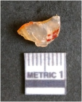 | Description / विवरण | The chalcedony flake is pale in color and translucent in appearance. The piece has s harp flaked ends and a bulbous end due to flaking. The flake has a crypto-crystalline silica matrix. |