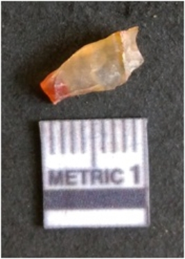 | Description / विवरण | The chalcedony flake is pale in color and translucent in appearance. The piece has s harp flaked ends and a bulbous end due to flaking. The flake has a crypto-crystalline silica matrix. |