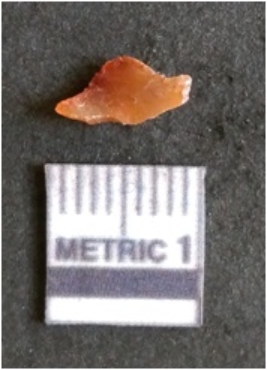 | Description / विवरण | The chalcedony flake is pale in color and translucent in appearance. The piece has s harp flaked ends and a bulbous end due to flaking. The flake has a crypto-crystalline silica matrix. |