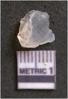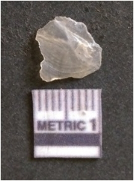 | Description / विवरण | The chalcedony flake is pale in color and translucent in appearance. The piece has s harp flaked ends and a bulbous end due to flaking. The flake has a crypto-crystalline silica matrix. |