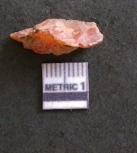 | Description / विवरण | It is a carnelian flake, with a striking platform with bulb of percussion on the ventral side. It is orangish in color, flake edges on the surface with ripple on it due to heavy percussion. |