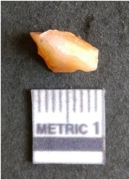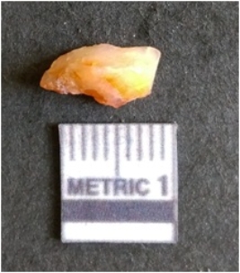 | Description / विवरण | The chalcedony flake is pale in color and translucent in appearance. The piece has s harp flaked ends and a bulbous end due to flaking. The flake has a crypto-crystalline silica matrix. |