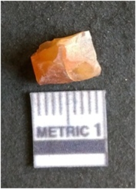 | Description / विवरण | The chalcedony flake is pale in color and translucent in appearance. The piece has s harp flaked ends and a bulbous end due to flaking. The flake has a crypto-crystalline silica matrix. |