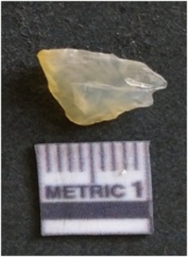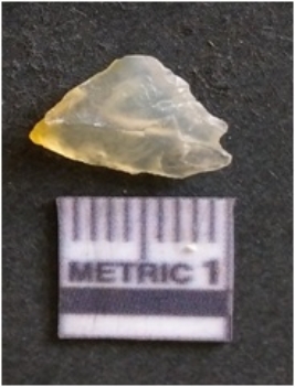 | Description / विवरण | The chalcedony flake is pale in color and translucent in appearance. The piece has s harp flaked ends and a bulbous end due to flaking. The flake has a crypto-crystalline silica matrix. |