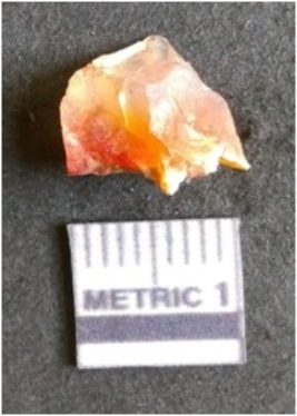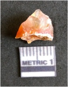 | Description / विवरण | The chalcedony flake is pale in color and translucent in appearance. The piece has s harp flaked ends and a bulbous end due to flaking. The flake has a crypto-crystalline silica matrix. |