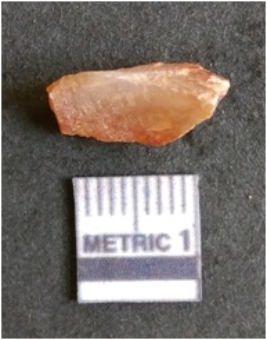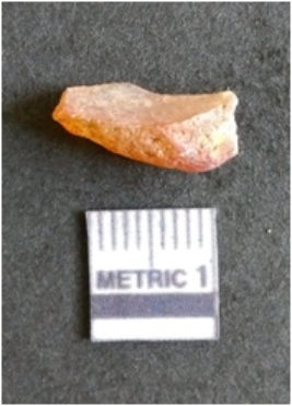 | Description / विवरण | The chalcedony flake is pale in color and translucent in appearance. The piece has s harp flaked ends and a bulbous end due to flaking. The flake has a crypto-crystalline silica matrix. |