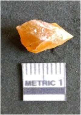 | Description / विवरण | The chalcedony flake is pale in color and translucent in appearance. The piece has s harp flaked ends and a bulbous end due to flaking. The flake has a crypto-crystalline silica matrix. |