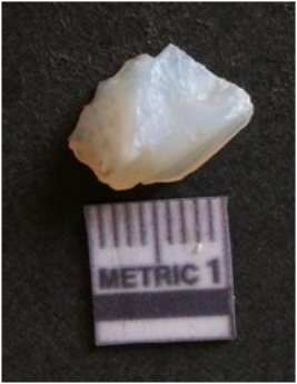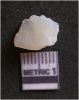 | Description / विवरण | The chalcedony flake is pale in color and translucent in appearance. The piece has s harp flaked ends and a bulbous end due to flaking. The flake has a crypto-crystalline silica matrix. |