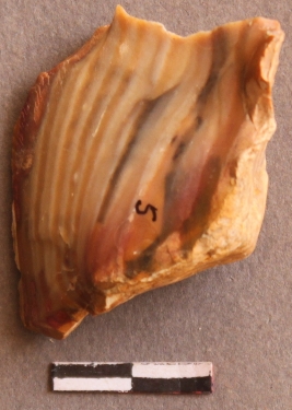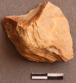 | Description / विवरण | Yellow ochre colored banded agate stone with cut, flaked ridges on one side and bulb of percussion on other. |