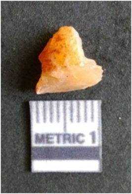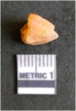 | Description / विवरण | The chalcedony flake is pale in color and translucent in appearance. The piece has s harp flaked ends and a bulbous end due to flaking. The flake has a crypto-crystalline silica matrix. |