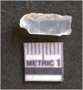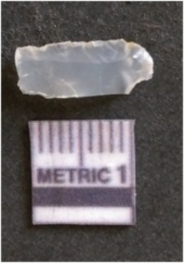 | Description / विवरण | The chalcedony flake is pale in color and translucent in appearance. The piece has s harp flaked ends and a bulbous end due to flaking. The flake has a crypto-crystalline silica matrix. |