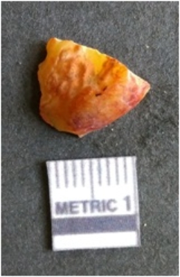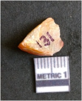 | Description / विवरण | The carnelian flake is red in color, with angular flaked edges and a bulbous end. The piece has sharp pointed end and a crypto-crystalline matrix. The piece is reddish in color; with silica base. |