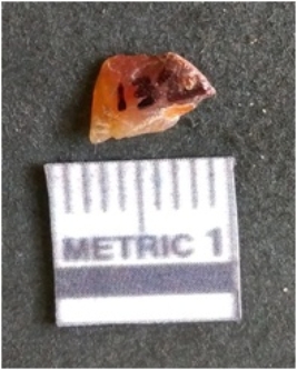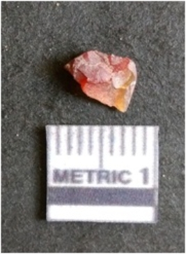 | Description / विवरण | The carnelian flake is red in color, with angular flaked edges and a bulbous end. The piece has sharp pointed end and a crypto-crystalline matrix. The piece is reddish in color; with silica base. |
