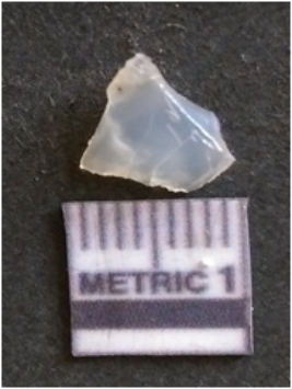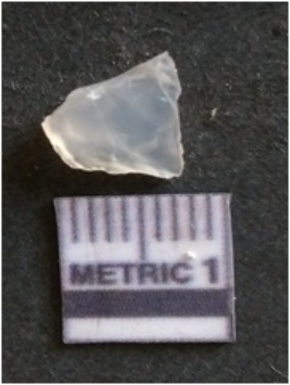| Description / विवरण | The chalcedony flake is pale in color and translucent in appearance. The piece has s harp flaked ends and a bulbous end due to flaking. The flake has a crypto-crystalline silica matrix. |