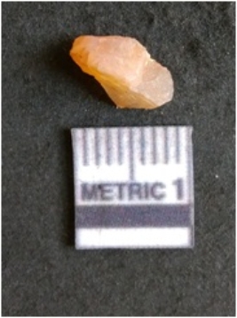 | Description / विवरण | The carnelian flake is red in color, with angular flaked edges and a bulbous end. The piece has sharp pointed end and a crypto-crystalline matrix. The piece is reddish in color; with silica base. |