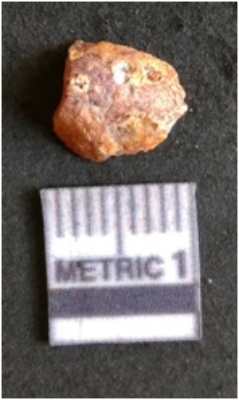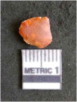 | Description / विवरण | The carnelian flake is red in color, with angular flaked edges and a bulbous end. The piece has sharp pointed end and a crypto-crystalline matrix. The piece is reddish in color; with silica base. |