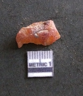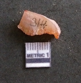 | Description / विवरण | It is a carnelian flake, with a striking platform with bulb of percussion on the ventral side. It is orangish in color, flake edges on the surface with ripple on it due to heavy percussion. |