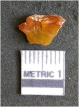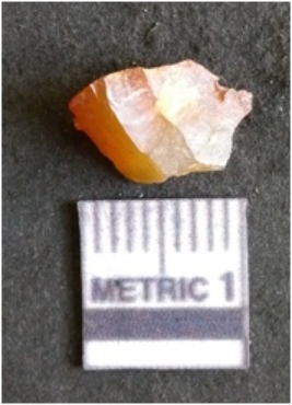 | Description / विवरण | The carnelian flake is red in color, with angular flaked edges and a bulbous end. The piece has sharp pointed end and a crypto-crystalline matrix. The piece is reddish in color; with silica base. |