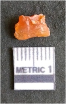 | Description / विवरण | The carnelian flake is red in color, with angular flaked edges and a bulbous end. The piece has sharp pointed end and a crypto-crystalline matrix. The piece is reddish in color; with silica base. |