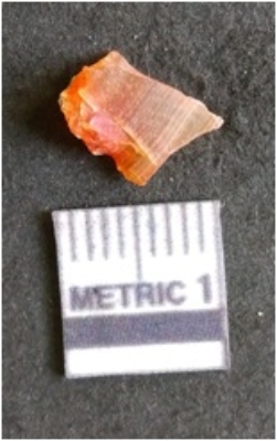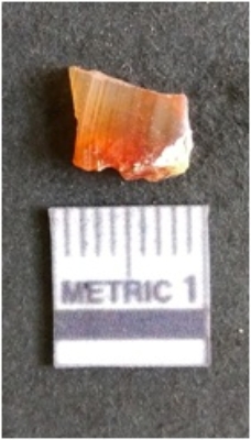 | Description / विवरण | The carnelian flake is red in color, with angular flaked edges and a bulbous end. The piece has sharp pointed end and a crypto-crystalline matrix. The piece is reddish in color; with silica base. |