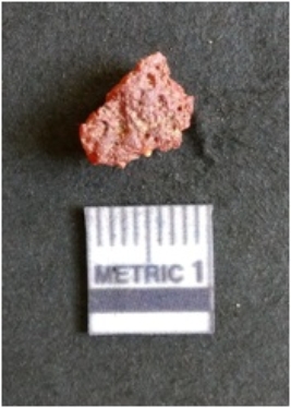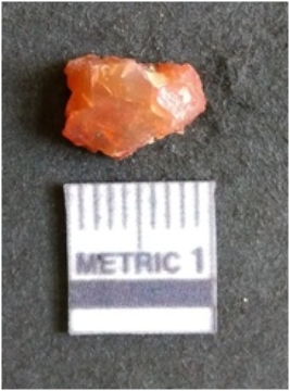 | Description / विवरण | The carnelian flake is red in color, with angular flaked edges and a bulbous end. The piece has sharp pointed end and a crypto-crystalline matrix. The piece is reddish in color; with silica base. |