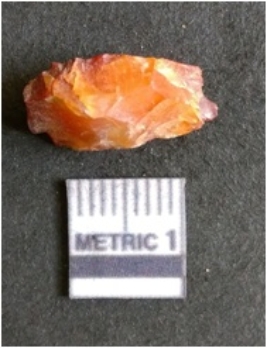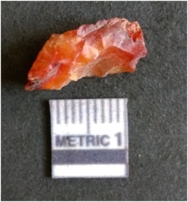 | Description / विवरण | The carnelian flake is red in color, with angular flaked edges and a bulbous end. The piece has sharp pointed end and a crypto-crystalline matrix. The piece is reddish in color; with silica base. |