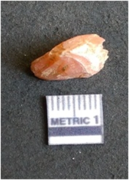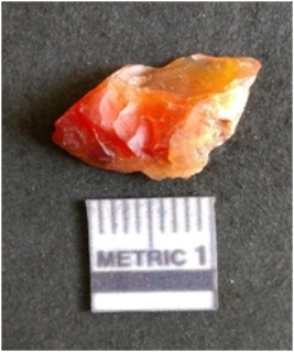| Description / विवरण | The carnelian flake is red in color, with angular flaked edges and a bulbous end. The piece has sharp pointed end and a crypto-crystalline matrix. The piece is reddish in color; with silica base. |