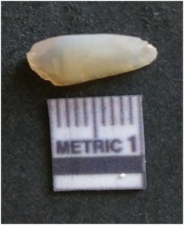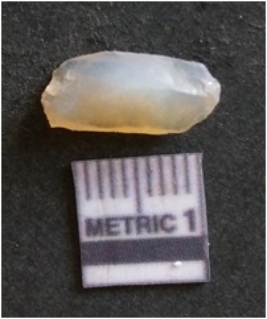 | Description / विवरण | The chalcedony flake is pale in color and translucent in appearance. The piece has s harp flaked ends and a bulbous end due to flaking. The flake has a crypto-crystalline silica matrix. |