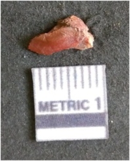 | Description / विवरण | The jasper flake is crypto-crystalline in nature, with a regular fracture pattern. the piece has flake scars on the surface and a bulb of percussion on the anterior end. The piece is dark in colour, with sharp flaked edges. |