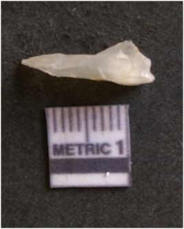 | Description / विवरण | The chalcedony flake is pale in color and translucent in appearance. The piece has s harp flaked ends and a bulbous end due to flaking. The flake has a crypto-crystalline silica matrix. |