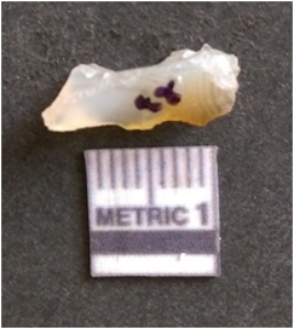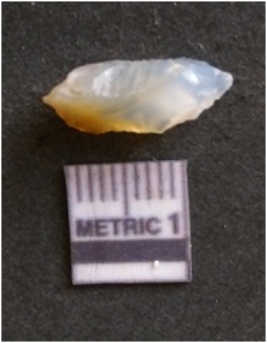 | Description / विवरण | The chalcedony flake is pale in color and translucent in appearance. The piece has s harp flaked ends and a bulbous end due to flaking. The flake has a crypto-crystalline silica matrix. |