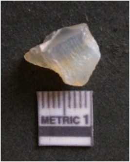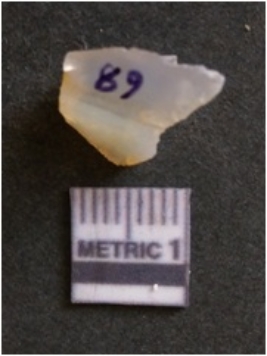 | Description / विवरण | The chalcedony flake is pale in color and translucent in appearance. The piece has s harp flaked ends and a bulbous end due to flaking. The flake has a crypto-crystalline silica matrix. |
