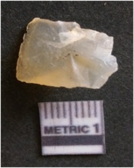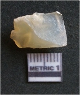 | Description / विवरण | The chalcedony flake is pale in color and translucent in appearance. The piece has s harp flaked ends and a bulbous end due to flaking. The flake has a crypto-crystalline silica matrix. |